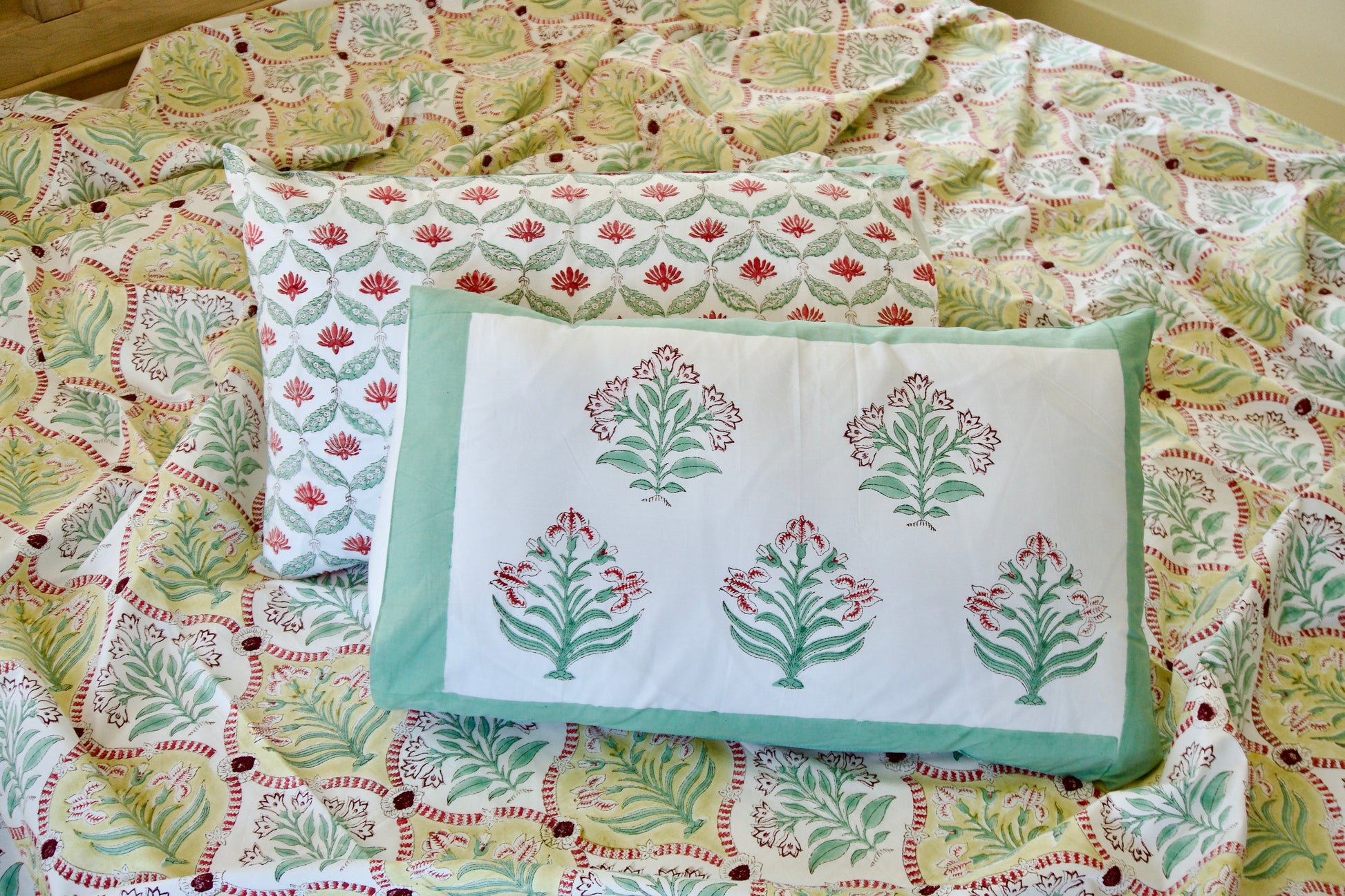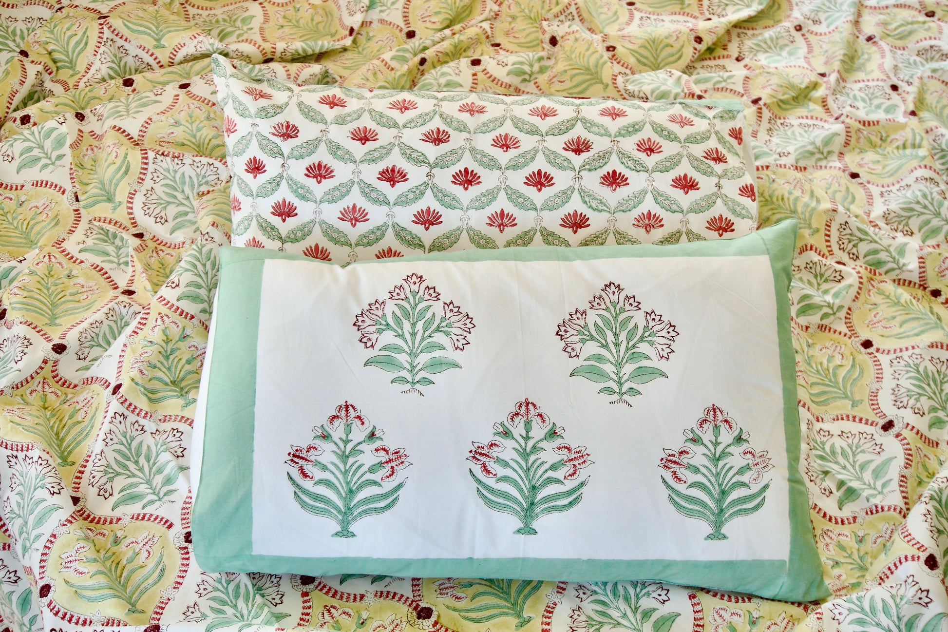 Bring a touch of timeless sophistication to your bedroom with Sage Elegance, hand block-printed on 100% organic cotton. Featuring soft green leafy motifs with subtle red floral accents on a crisp white base, finished with a sage border and vine-inspired pillowcases, this design blends heritage craftsmanship with modern simplicity. Soft, breathable, and eco-friendly, it’s made for comfort and effortless style.