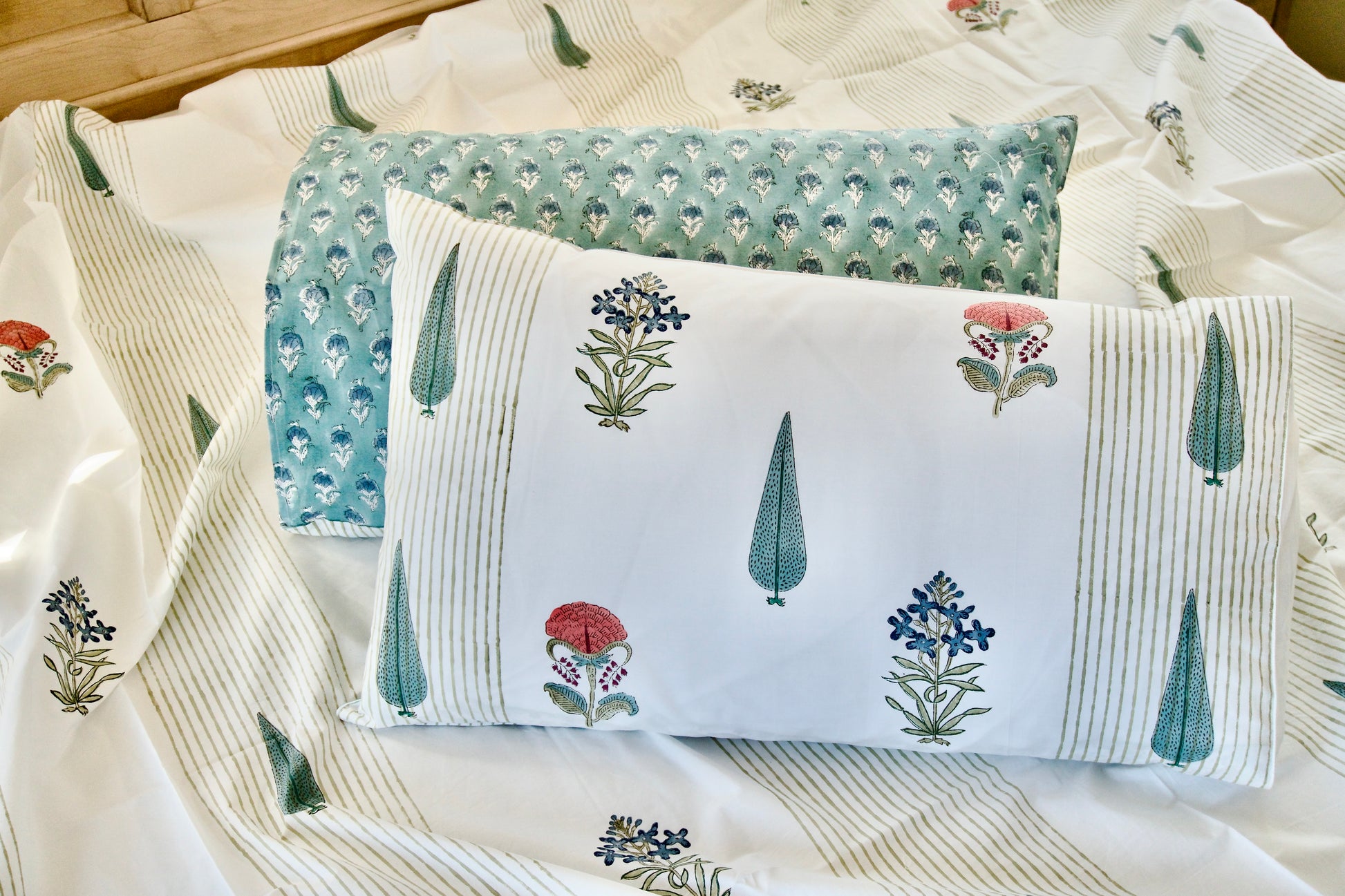 Bring timeless charm into your bedroom with the Cypress Garden bedsheet, hand block-printed on 100% organic cotton. Featuring elegant green cypress trees, vibrant florals in blue, pink, and red, and a fresh striped backdrop, this sheet blends nature-inspired artistry with modern comfort. Soft, breathable, and eco-friendly, it’s perfect for restful nights and everyday elegance.