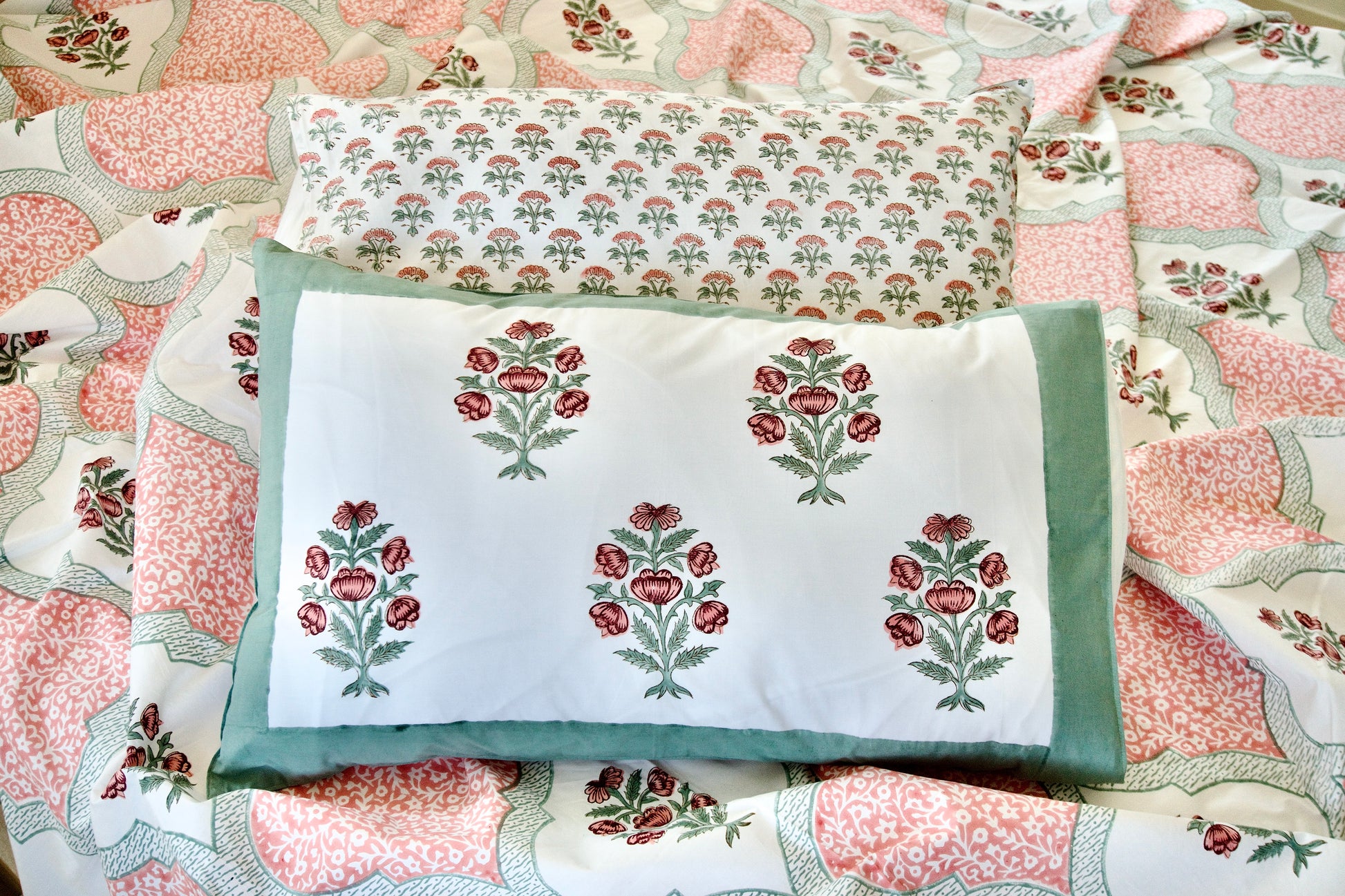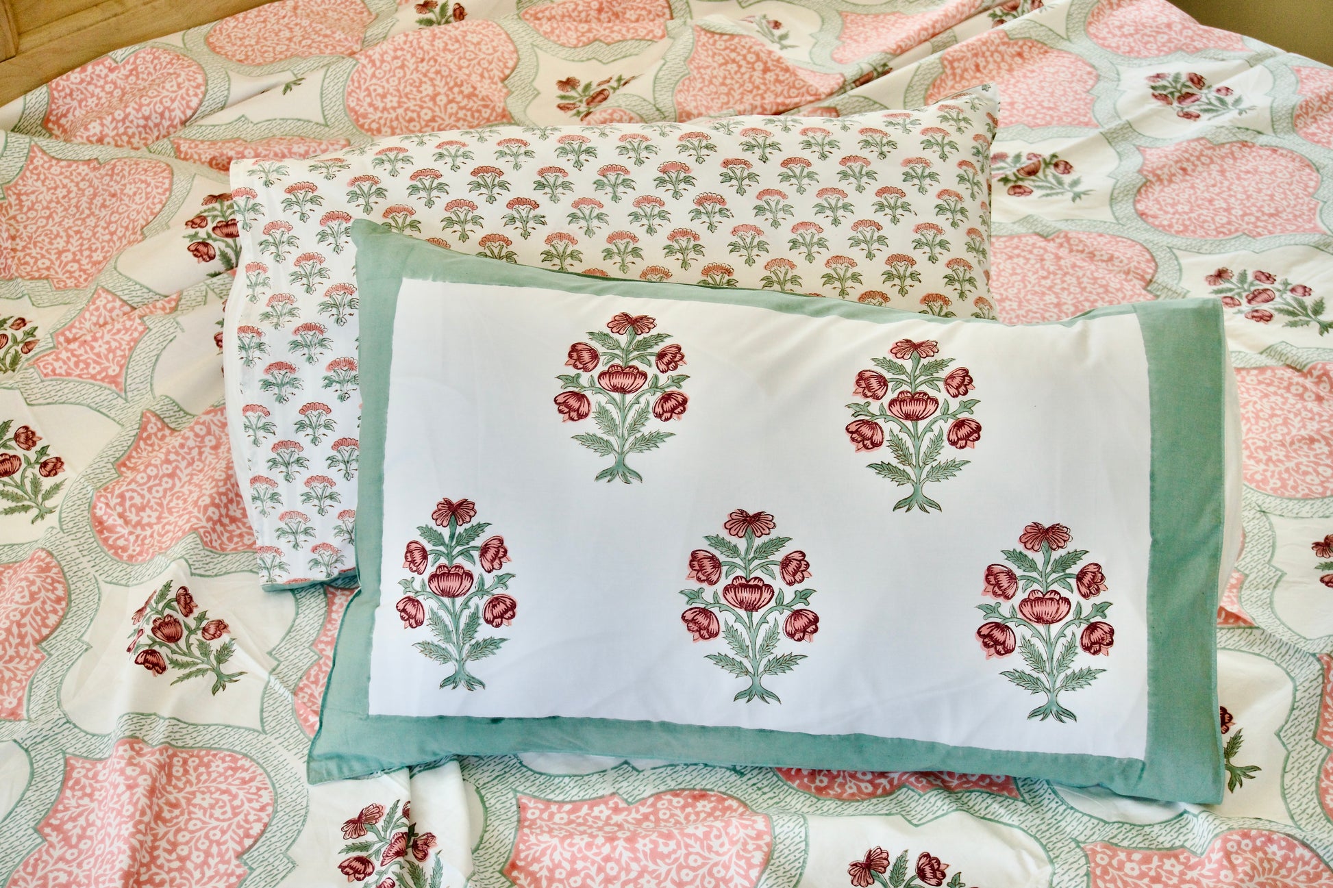 Delicate yet bold, the Scarlet Whisper bedsheet is hand block-printed on 100% organic cotton. Featuring rich scarlet florals with green accents on a crisp white base, framed by an aqua border and patterned pillows, it blends heritage craftsmanship with modern sophistication. Soft, breathable, and eco-friendly, it’s designed for restful nights and timeless style.