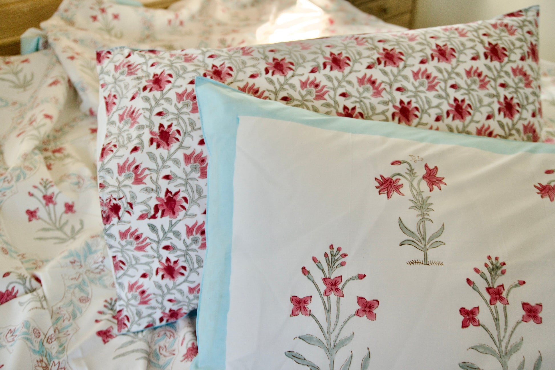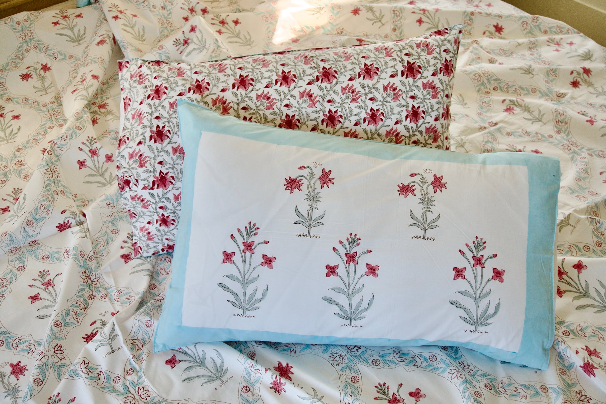 Soft and graceful, the Coral Veil bedsheet is hand block-printed on 100% organic cotton. Featuring coral-pink florals with green leaves on a white base, accented by a light blue pillow border and vine-inspired patterns, this sheet blends heritage block printing with modern freshness. Breathable, eco-friendly, and elegant, it’s designed for comfort that feels as delicate as it looks.