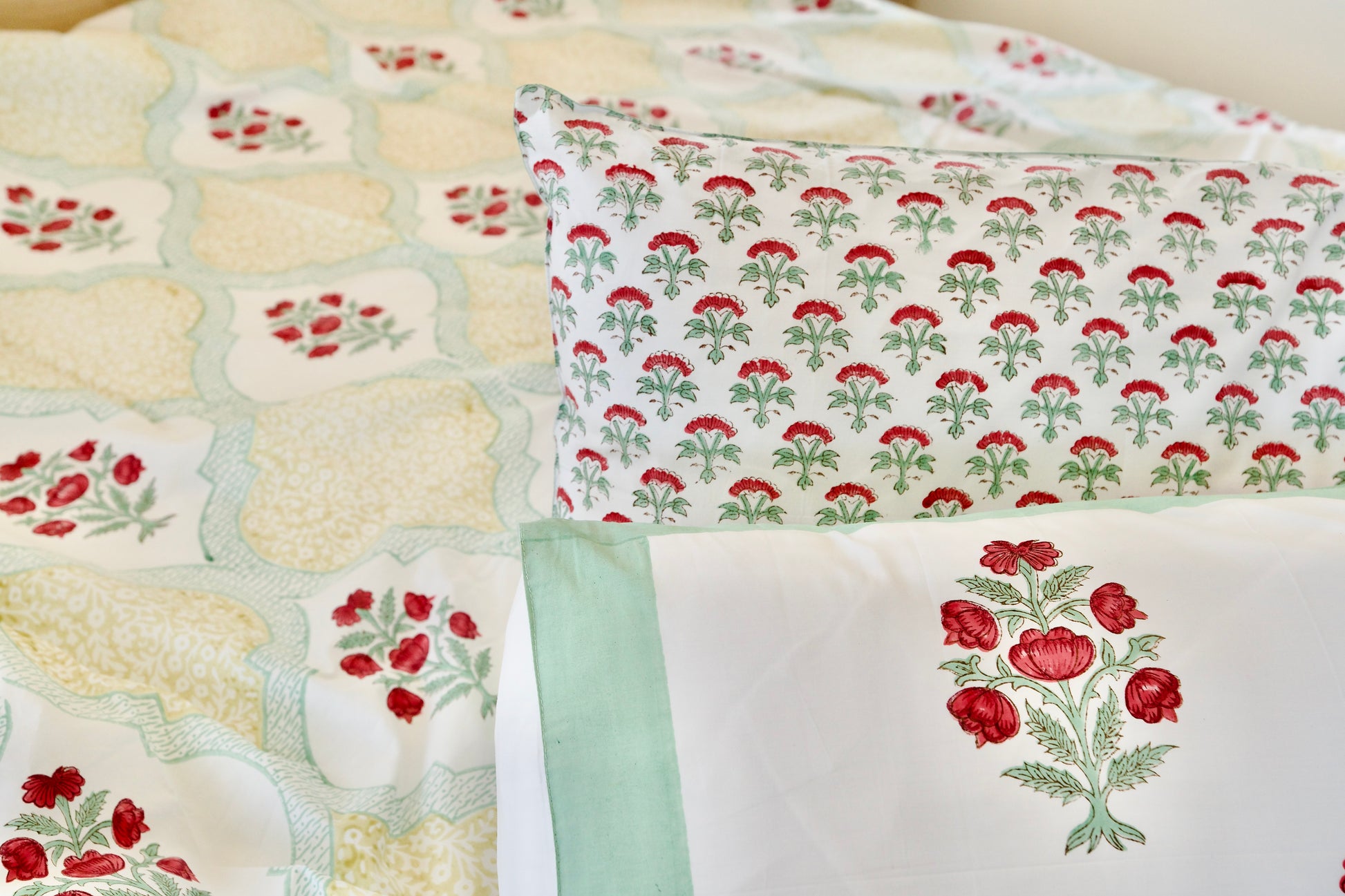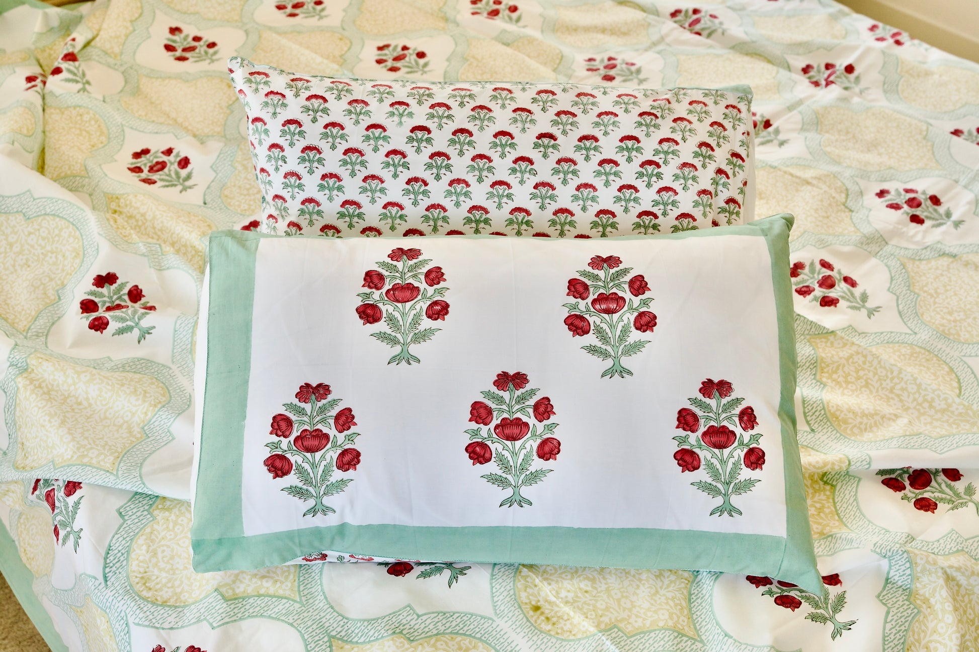 Bring bold elegance to your space with Scarlet Boughs, hand block-printed on 100% organic cotton. Showcasing clusters of scarlet florals with leafy green accents on a crisp white base, framed by sage borders and complemented with floral repeat pillowcases, this bedsheet blends traditional artistry with modern sophistication. Soft, breathable, and eco-friendly, it offers timeless comfort with style.